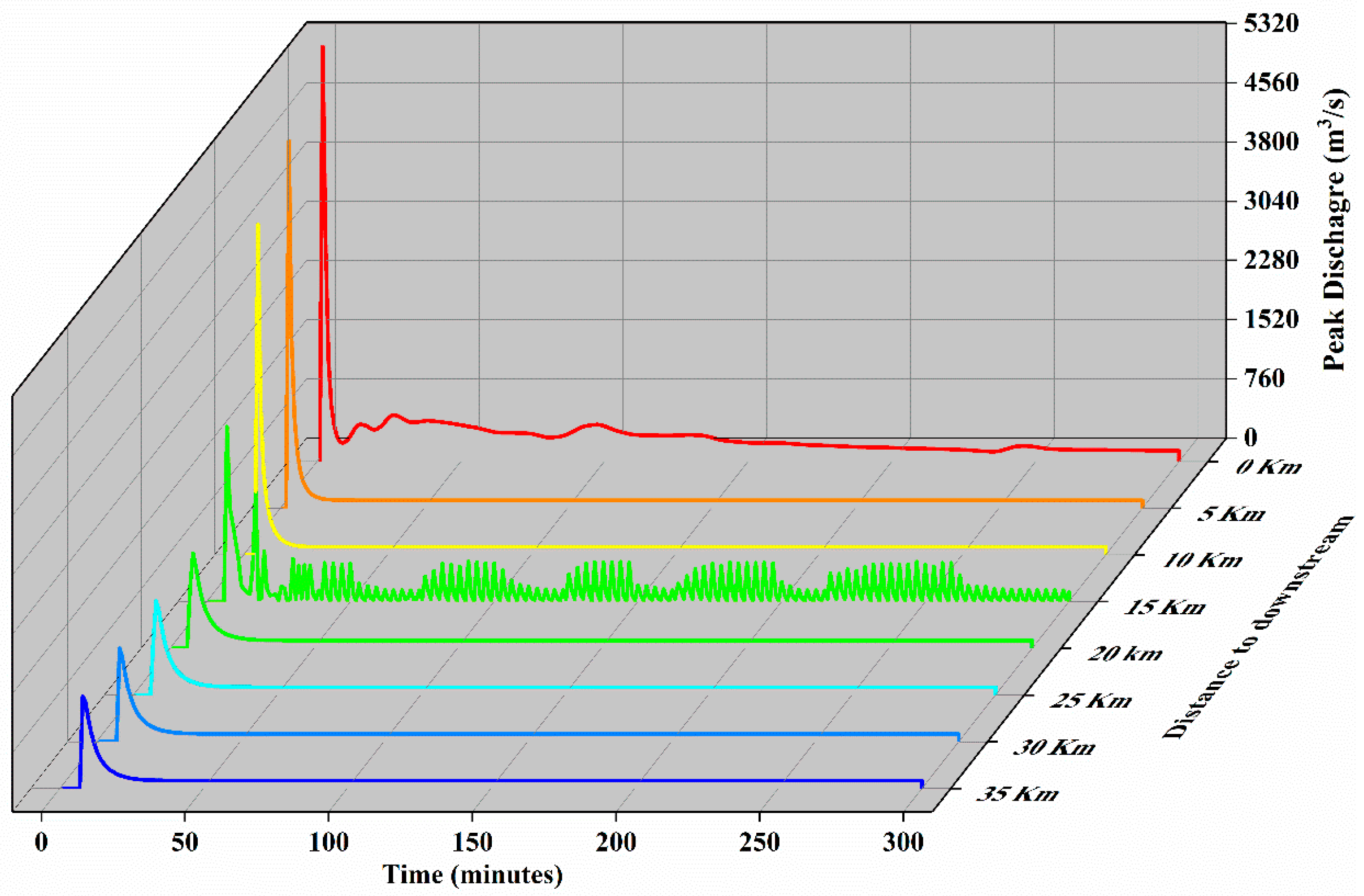 | Location | Distance from the Dam Outlet (km) | Peak Flow Discharge (m3/s) | Flood Arrival Time (min) |