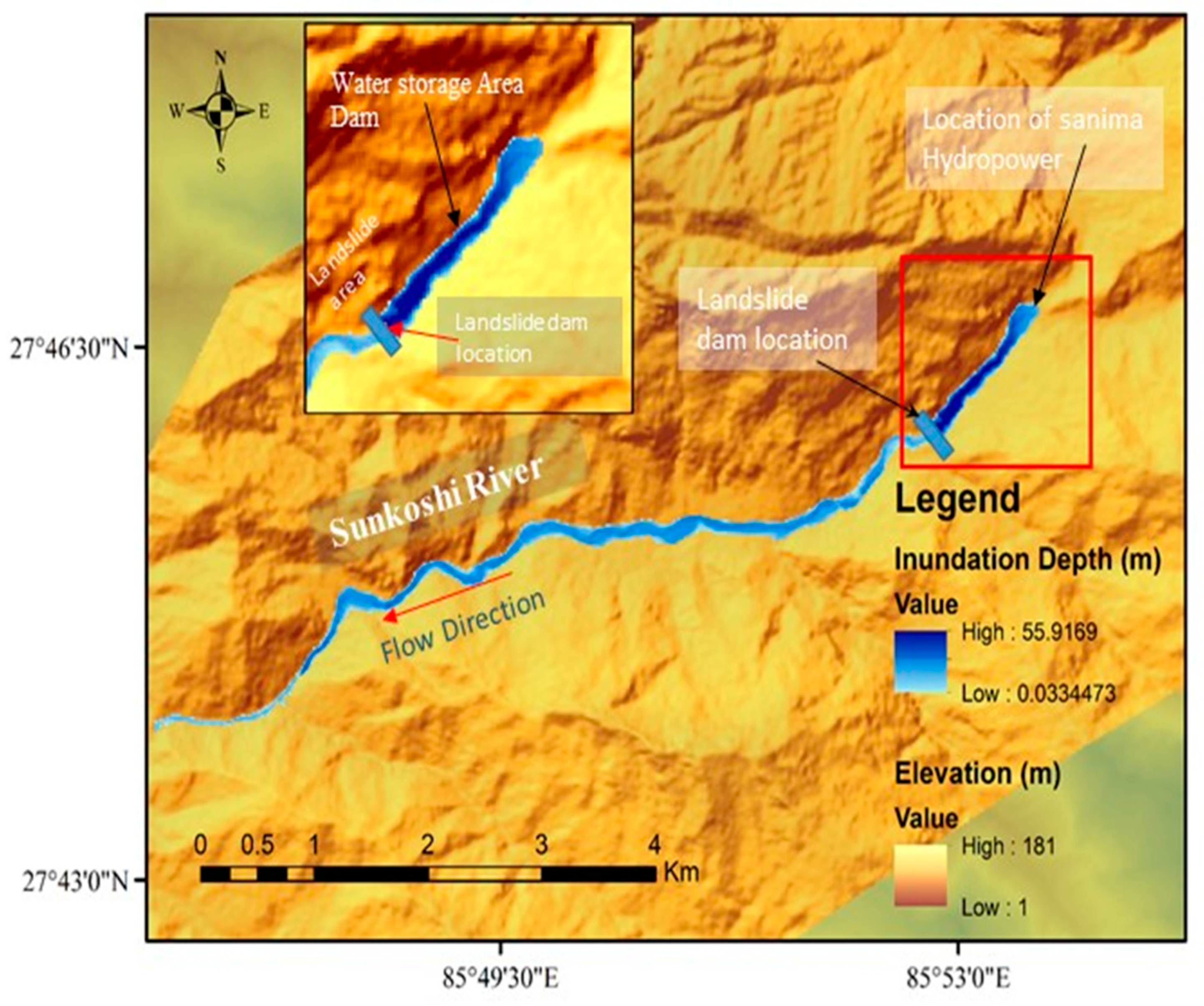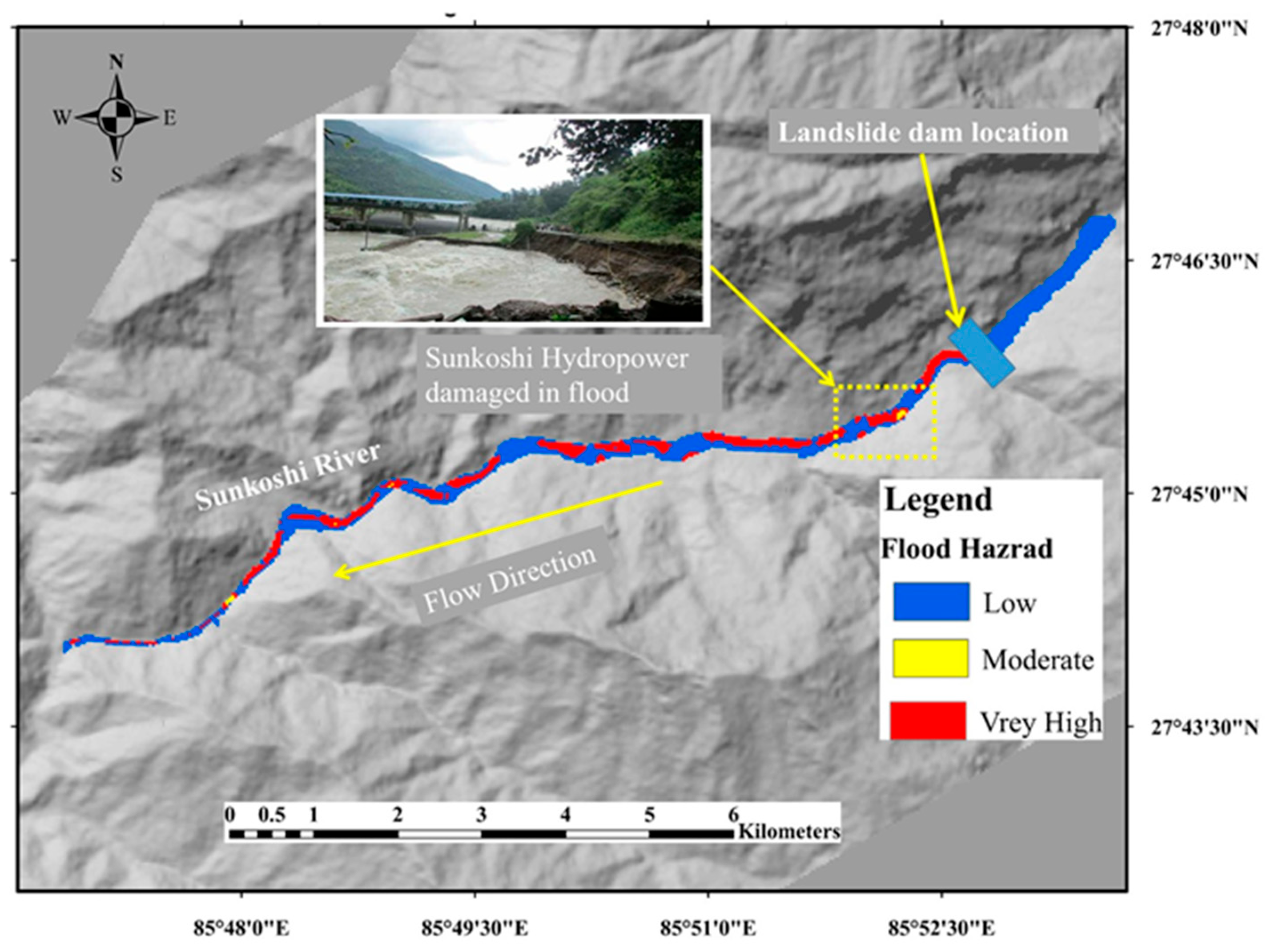 - Shrestha, B.B.; Nakagawa, H. Hazard assessment of the formation and failure of the Sunkoshi landslide dam in Nepal. Nat. Hazards 2016, 82, 2029–2049. [Google Scholar] [CrossRef]
