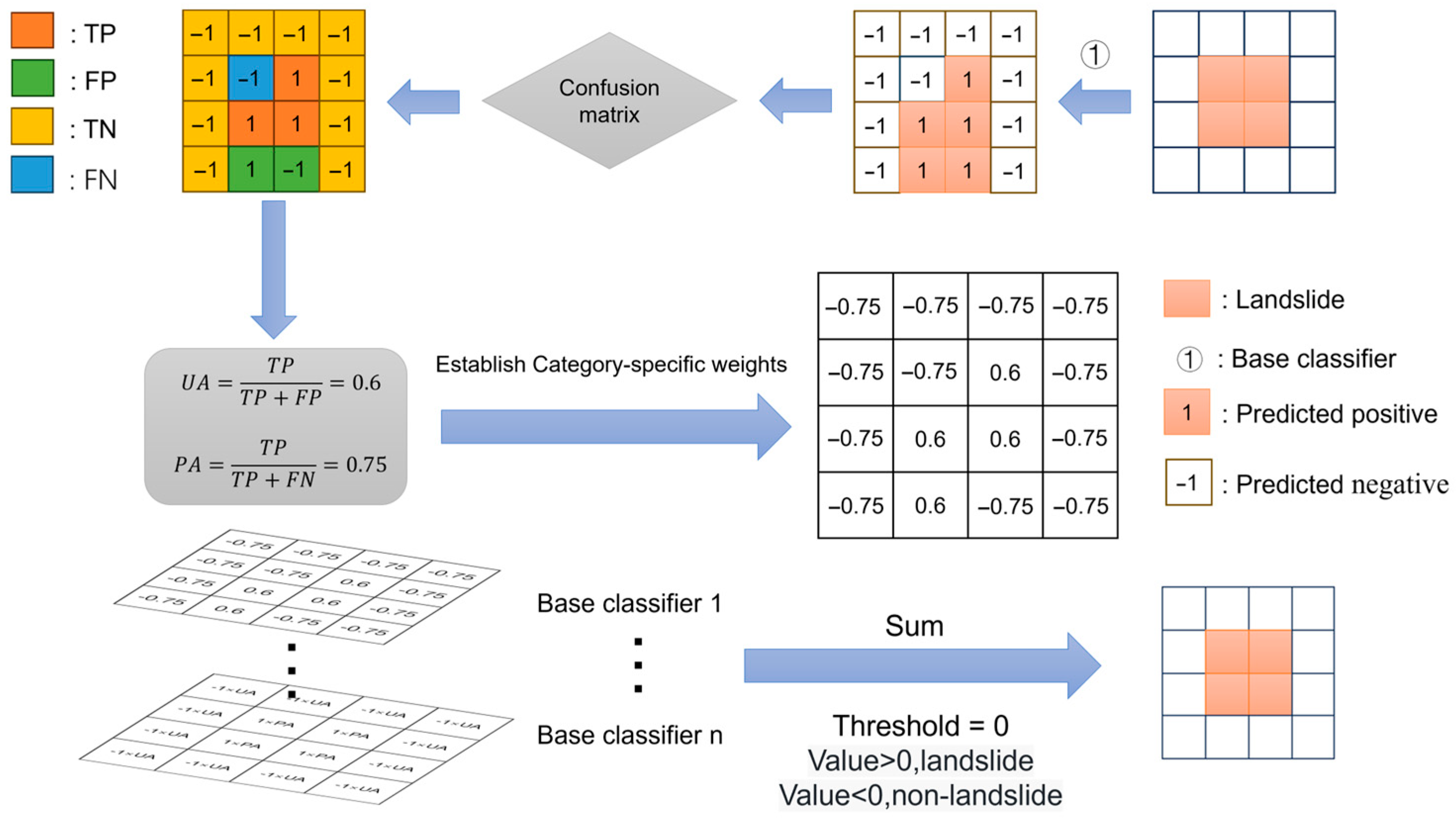- Apply weights to the binarized images of co-seismic landslides obtained from each classifier to generate weighted images.