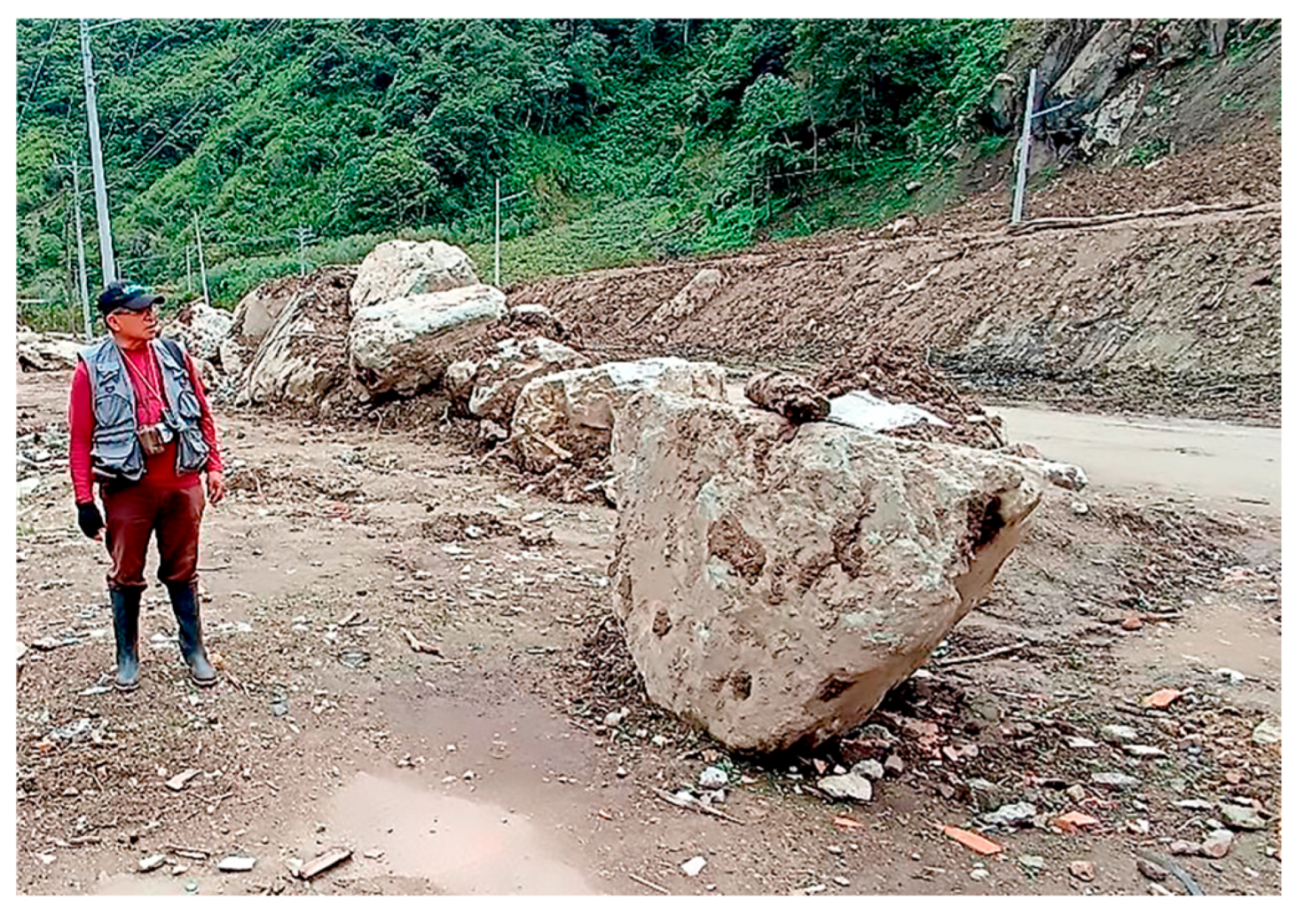 Figure 5. Some boulders settled at the toe of the landslide, which were embedded in the mudflow materials. The analyzed landslide materials comprised vegetal soil overburden, mud, alteration soil, and rocks, being a complex mass running downslope.