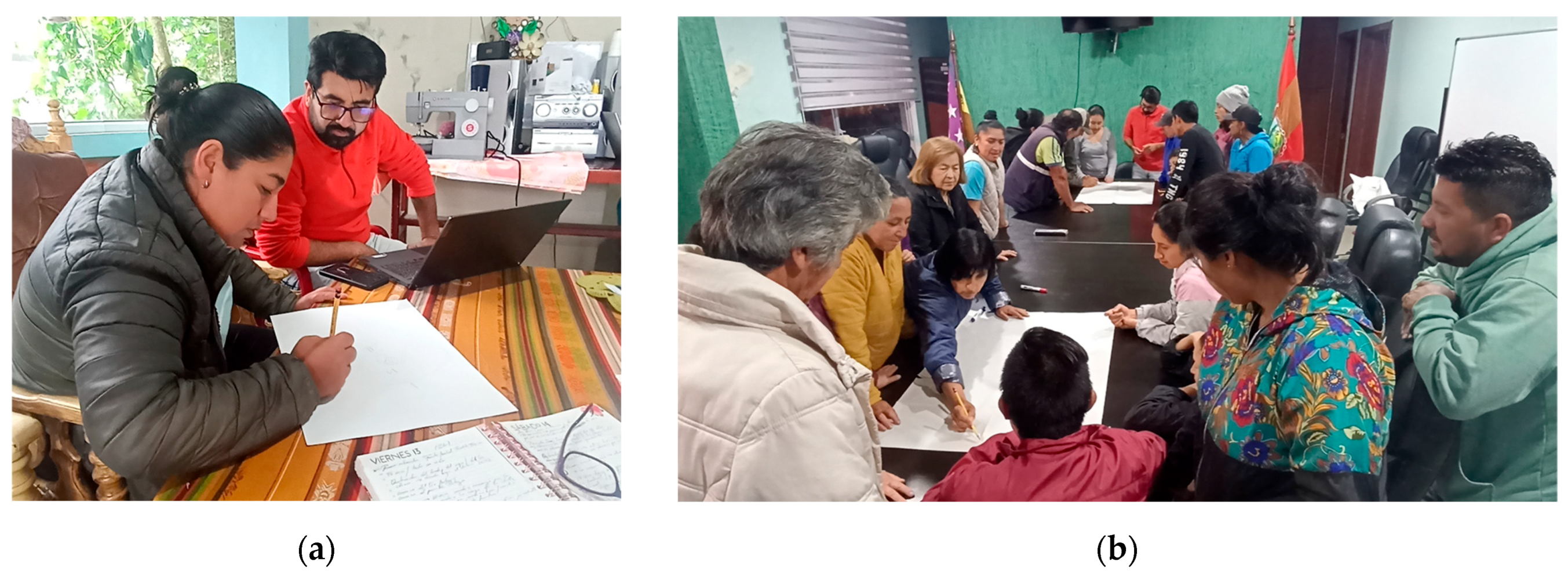 Figure 7. (a) Interviews and development of group tasks for the residents of the El Placer hamlet. (b) Participatory exercise for the development of talking maps with the affected residents of Qui-lloturo.