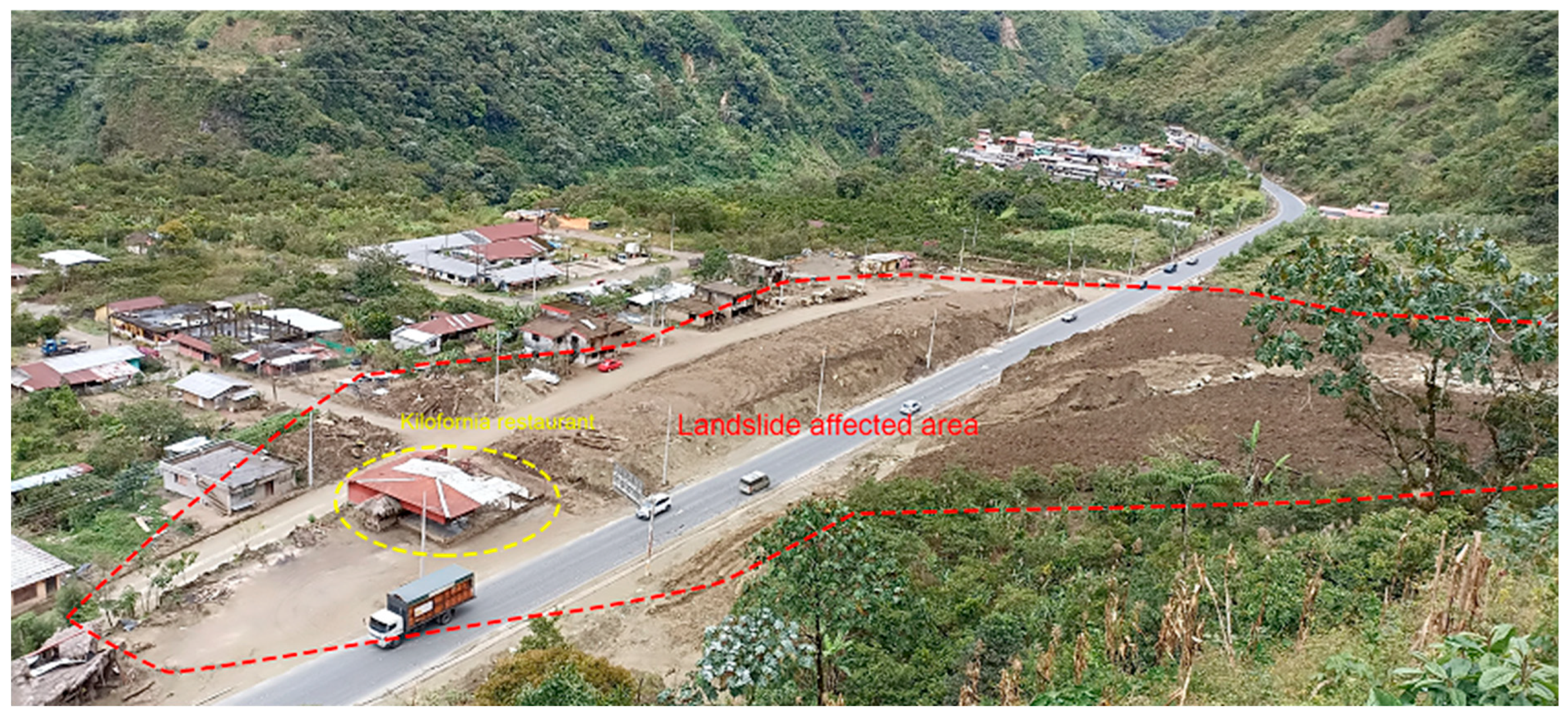 Regarding the occurrence of recent events, documentary evidence is available, including technical reports from the National Risk Management Secretariat (SNGR) and digital press records. For example, the Situation Report—Rainy Season Ecuador No. 25 [31] from the National Risk Management Secretariat (SNGR, the Spanish abbreviation) indicates that on 28 April 2018, several landslides occurred, affecting the Baños-Puyo road (E30). Specifically, the landslide in the El Placer sector swept away a bus, resulting in two deaths and 28 injuries [32]. According to information from residents, the landslide was caused by a collapse resulting from water damming, which triggered a debris flow from the hillside onto the road.