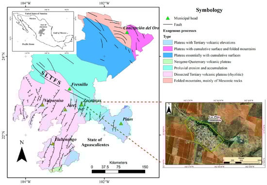 - Escalona-Alcázar, F.J.; Escobedo-Arellano, B.; Castillo-Félix, B.; García-Sandoval, P.; Gurrola-Menchaca, L.L.; Carrillo-Castillo, C.; Núñez-Peña, E.P.; Bluhm-Gutiérrez, J.; Esparza-Martínez, A. A geologic and geomorphologic analysis of the Zacatecas and Guadalupe quadrangles in order to define hazardous zones associated with the erosion processes. In Sustainable Development: Authoritative and Leading Edge Content for Environmental Management; InTech: Rijeka, Croatia, 2012. [Google Scholar] [CrossRef]