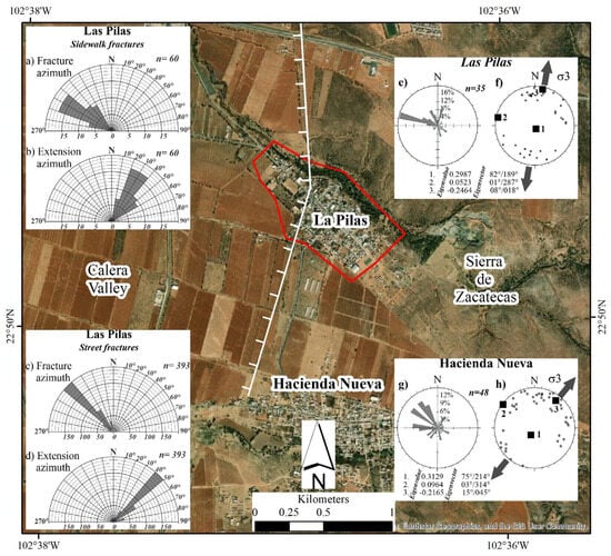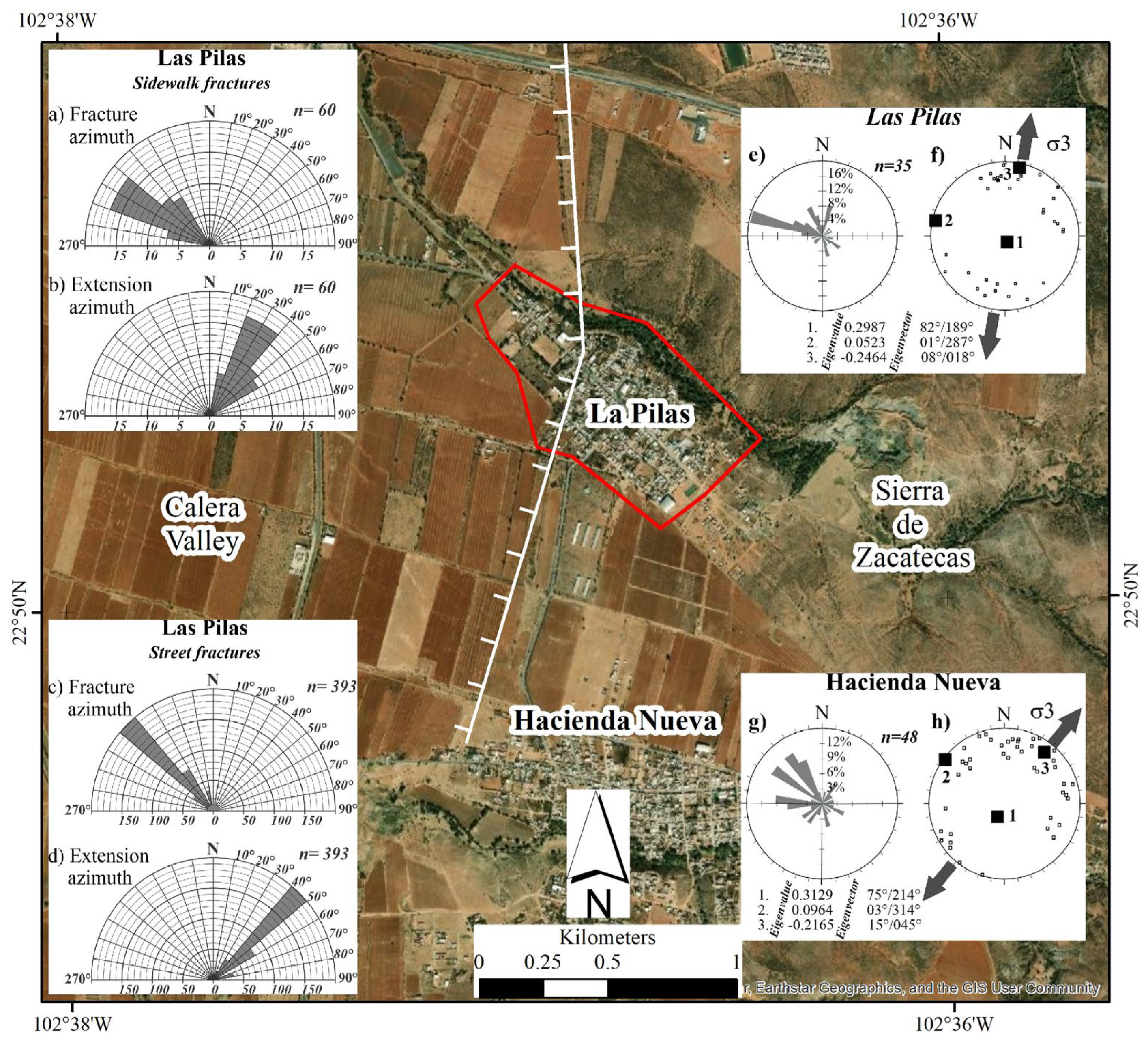 - Escalona-Alcázar, F.J.; Pineda-Martínez, L.F.; Rodríguez-González, B.; Reveles-Flores, S.M.T.; Valle-Rodríguez, S.; Chávez-Guajardo, A.E.; Mandujano-García, C.D. La influencia de la deformación del basamento en el desarrollo de fracturas en la infraestructura urbana de la Zona Metropolitana de Zacatecas. GEOS 2023, 43, 94. [Google Scholar]