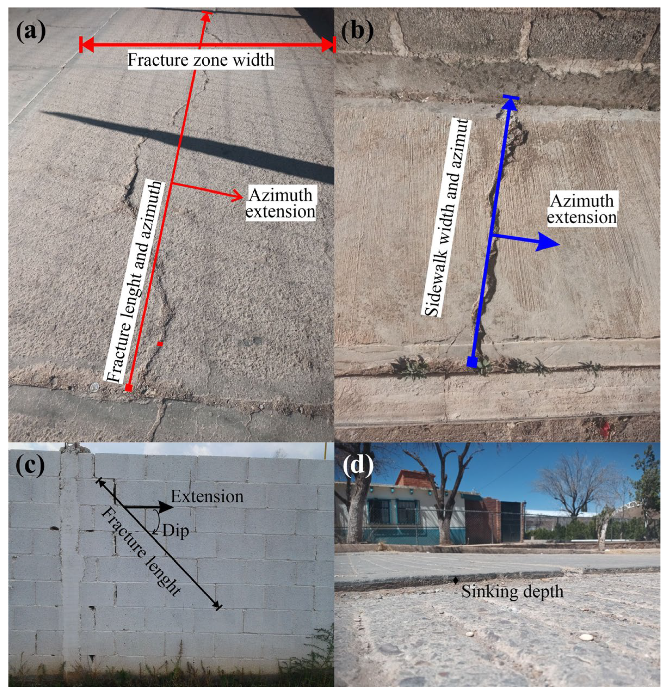 - The final category assessed was the subsidence of sidewalks and street blocks (Figure 4d), for which only the magnitude of vertical displacement (depth) was measured. The georeferencing point is the one with the maximum displacement.