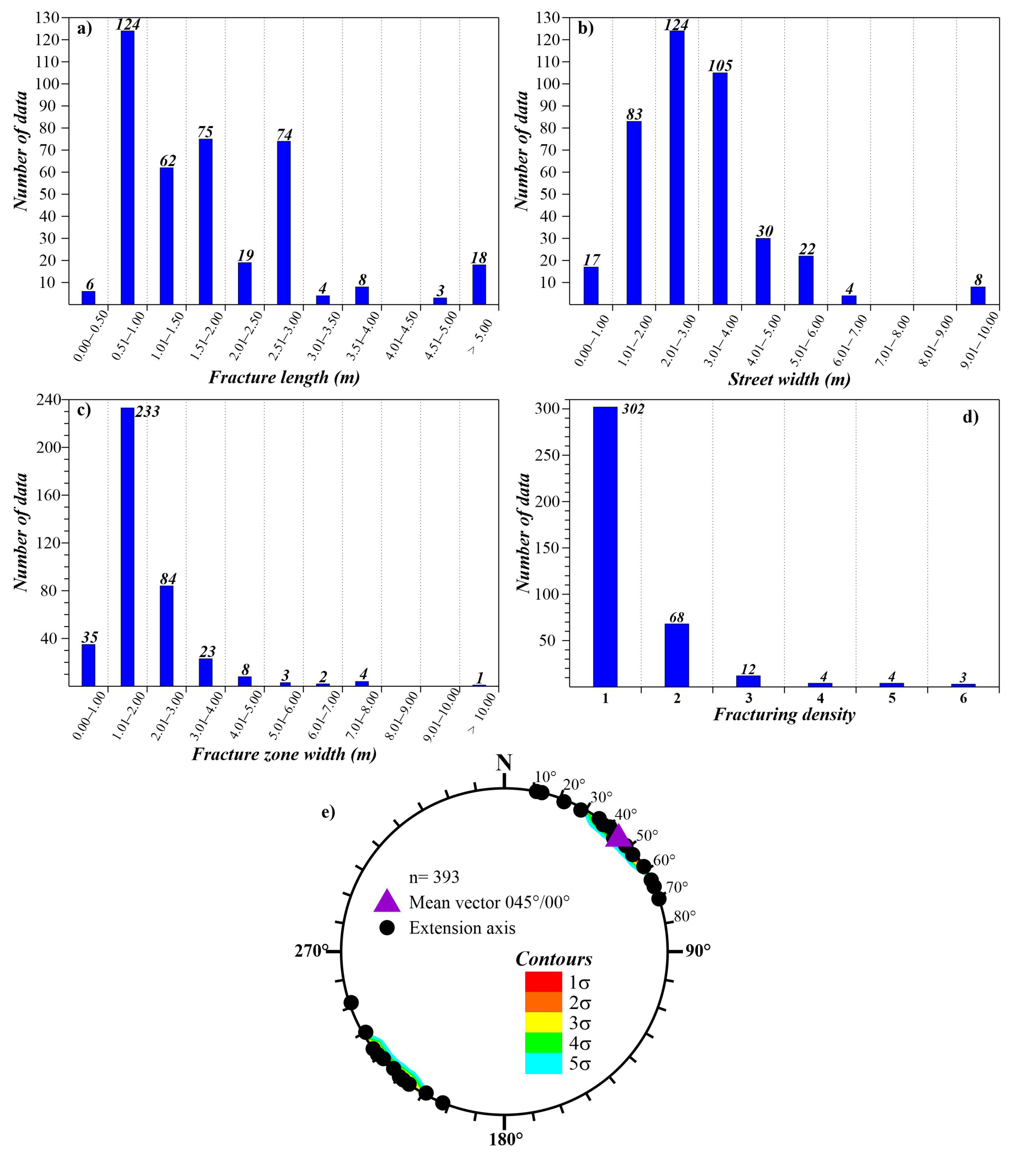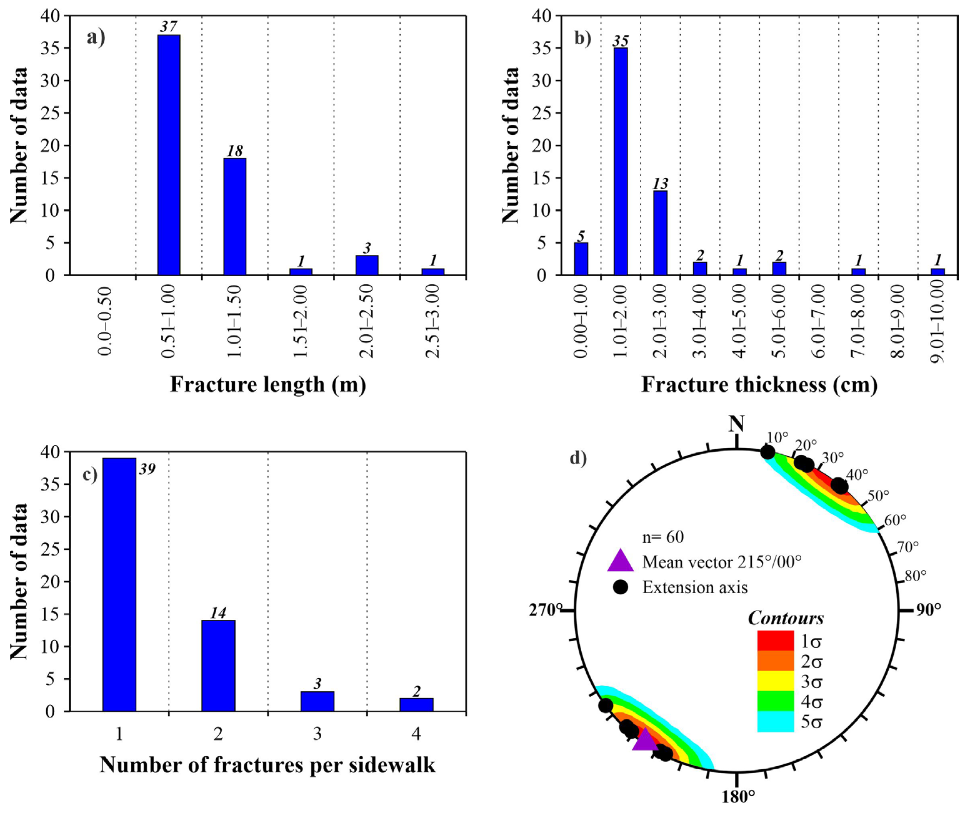 - For Wall fractures (Figure 4c), the house front width is noted at the location of the most significant fracture, along with the fracture’s maximum thickness. If the fracture trace is irregular, the endpoints are used to determine its length and dip, with the extension azimuth being equated to the dip direction. In the case of vertical fracture, the extension azimuth is aligned with the walking survey path. This kind of fracture was georeferenced using the middle point of the wall where it is located.