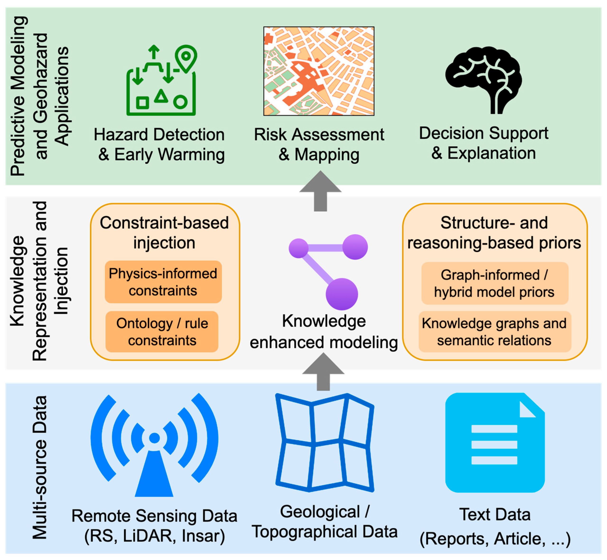 | Remote sensing imagery | Sentinel-1/2, Landsat, UAV/aerial imagery, LiDAR-derived slope units | Geomorphology/land-cover ontology; image entity/event graph linking scar, runout, water extent, damaged assets, time, and location | Ontology-aligned labeling and KG grounding transform visual observations into interpretable hazard entities; support cross-source alignment with reports and geospatial metadata, and improve spatially coherent explanation | [45,88,89] |