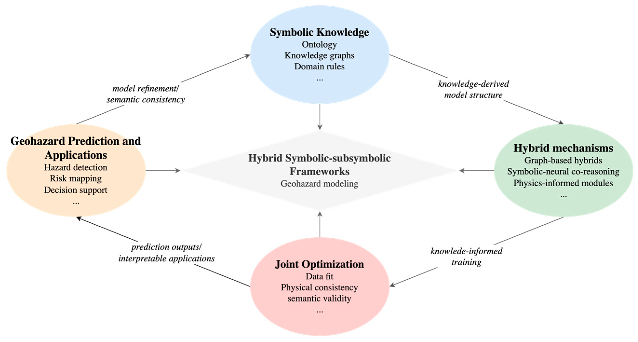 | Multi-source/multimodal evidence | Combined imagery, GIS layers, sensors, text reports, prior simulations/models | Multimodal KG/ontology + neural embeddings + provenance graph | Cross-modal grounding aligns visual, textual, and numerical evidence; supports hypothesis generation, scenario comparison, and validated knowledge updating across reasoning cycles | [46,86,88,90,93] |