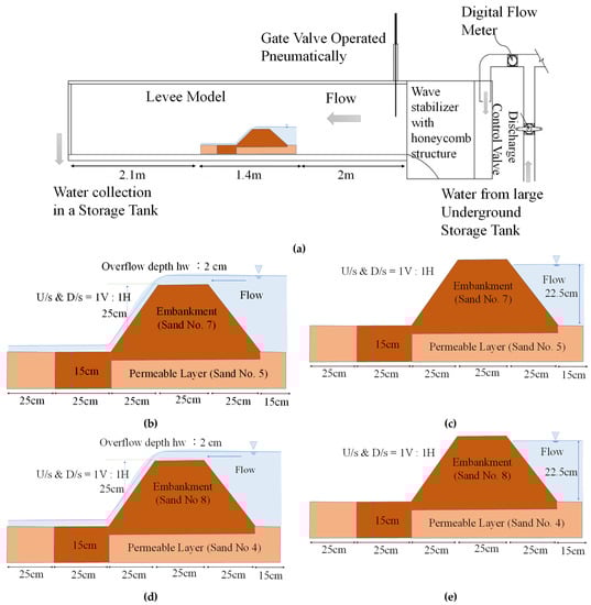 The flow conditions in this study aimed to simulate medium flood or low tsunami conditions. The overtopping depth on the levees was established at 0.02 m, which corresponds to 0.4 m in the test specimen using the model scale (1/20), ensuring similarity in the Froude number. The inflow discharge (Q) for overtopping was maintained at 2.27 × 10−3 m3/s, as measured by a digital flow meter. This discharge rate was carefully controlled to achieve a consistent overflow depth of 0.02 m in two experiments, namely O-E7-F5 and O-E8-F4, both of which were conducted under overflow conditions as shown in Figure 1b,d. In two infiltration experiments (IO-E7-F5 and IO-E8-F4, as shown in Figure 1c,e and as listed in Table 1), the depth of water on the upstream side of the levee was maintained at a constant depth of 0.225 m by closing the discharge control valve, while the water pump remained operational for approximately two hours. This setup was implemented to investigate the influence of infiltration resulting from the presence of a permeable layer. This condition was based on previous research that studied the effects of different water levels on levee stability [].