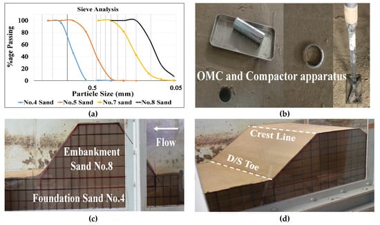 In this study, model levees made of Mikawa silica sand were utilized for overflow and infiltration experiments. These model levees had an elevation of 0.4 m, a crest thickness of 0.25 m, and back slopes with a ratio of 1:1. To consider the impact of scouring at the toe of the downstream slope, the model levees were built with a foundation thickness of 0.15 m. The materials used for the levee body and foundation were changed from No. 7 to No. 8 sand and No. 5 to No. 4 sand, respectively. The grain size distributions of the different sands are shown in Figure 2a. In addition to overflow experiments, infiltration experiments were conducted to investigate the influence of permeable layers beneath the levee structure. To ensure embankment strength, soil samples were collected from specific locations on the downstream and upstream slopes of each embankment model as shown in Figure 2b and their dry mass was determined; Figure 2c,d shows the embankment after preparation. Various parameters such as compaction degree, dry density, water content, hydraulic conductivity, mean grain size, and optimum water content were examined and are listed in Table 2.