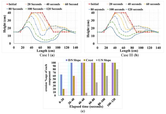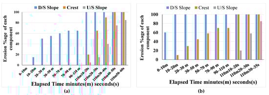 The degradation of levee components during infiltration events can have a significant impact on the safety and functionality of these structures. To better understand this process, experiments were conducted to investigate the relationship between the percentage of levee component erosion and the elapsed time for both infiltration cases. The results are presented in Figure 9a,b as a graphical representation. Interestingly, there were notable differences observed between the two cases. Specifically, in Case II, the percentage of erosion of levee components was found to be relatively small, with only downstream slope failure accounting for 65% of the total damage. This suggests that the rate of erosion was relatively slow, likely due to the lower permeability of the foundation materials in this case. On the other hand, Case IV exhibited a more severe erosion pattern, with the downstream slope failure progressing rapidly up to 70% of levee crest failure. This could be attributed to the higher permeability of the foundation sand in this case, which enabled the water to infiltrate more easily and quickly, resulting in a more rapid erosion process.