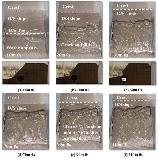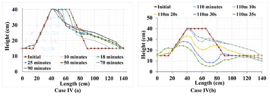 The seepage erosion process for Case IV is shown in Figure 7a–f and the erosion profiles at different elapsed times are shown in Figure 8a,b. A leak appeared at the bottom of the slope just 10 s after the start of the experiment. The high hydraulic conductivity of the sand in the foundation made it more permeable, and it became saturated when the water level reached the upstream slope at 0.225 m. This leakage occurred about 9 min and 10 s earlier than in Case II. Due to leakage in the embankment’s foundation, the slope became muddy, and a sand boil appeared. After that, a shear crack occurred on the slope at 5 min and 56 s, which became larger until 10 min and 55 s when a slip failure occurred. The slip failures progressed one after another toward the crest, and by 18 min, the whole downstream slope failure was observed. After 18 min, the cracks reached the crest area. Until 30 min, about 30% of the crest failed, after which the crest erosion slowed down and progressed slowly until 90 min when about 70% of the crest was ruptured. After 90 min, there was again some sort of equilibrium, and no further erosion occurred. At about 110 min, the crest was overtopped, and levee failure occurred in just 35 s. Overall, the sand in the foundation’s high hydraulic conductivity played a significant role in the seepage erosion process, causing the slope to become muddy and eventually leading to the levee’s failure.