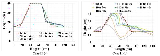 The seepage erosion process is shown in Figure 5a–f. The pictures depict top and side views at different time intervals for the destruction process, with lines indicating gridlines and the initial position of the levee slopes. Similarly, in Figure 6a,b, levee surface profiles showed erosion mechanisms at various elapsed times. The discharge was kept constant for both cases, and the water took about 10 min to reach a height of 0.225 m on the embankment. When the water reached the desired height, the stopwatch was started, and all times correspond to that point. In this case, a leak was seen near the bottom of the slope after 9 min and 20 s, which occurred about 9 min and 10 s later than in Case IV, reflecting the length of the high permeability region in the foundation. After that, the slope became muddy, and the bottom began to collapse uniformly at about 17 min. Water appeared on the whole downstream toe in the form of a sand boil, and cracks started propagating from the toe of the downstream slope to the top in a uniform pattern as shown in Figure 5. At 16 min and 45 s, a uniform crack on the whole downstream toe occurred, and a slip failure started. After that, slip failures progressed one after another toward the crest, with the maximum slope failure observed during the first 25 min. After that, the slope failure gradually slowed down. About 55 to 60% of the slope failed in about 70 min. After that, only 5% of the slope failure occurred within 90 min, after which a sort of equilibrium was observed, and no further slope failure was observed due to the lower head difference between the upstream and downstream slopes; the experiment was continued until almost no deformation of the levee body was observed. When the muddy material from the levee accumulates near the bottom of the slope, the collapse slows down or even stops as in the present case. After about 110 min, the crest overflowed and levee failure occurred in about one minute.
