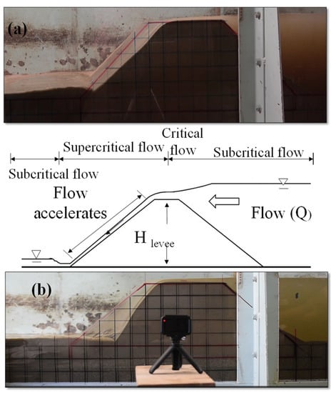 A 1/20 scale model was used in the experiment, where the dimensions of the model levee corresponded to an average height of 5 m for a real levee in Japan. The geometry of the levee and the depth of overtopping were key factors influencing erosion initiation and propagation. The embankment models were constructed using Mikawa silica sands, following a 5 cm thick layer and a compaction process. The initial embankment models were constructed with an oversized geometry and then trimmed down to the dimensions specified in Figure 1b–e. Discharge and flow conditions were described earlier. During the erosion process, which lasted less than 2.5 min in overflow cases and more than two hours in infiltration cases, visual inspection, video recording, and high-speed camera techniques were used to monitor the dike and water surface configurations. The resulting data were analyzed and are presented in Section 3.