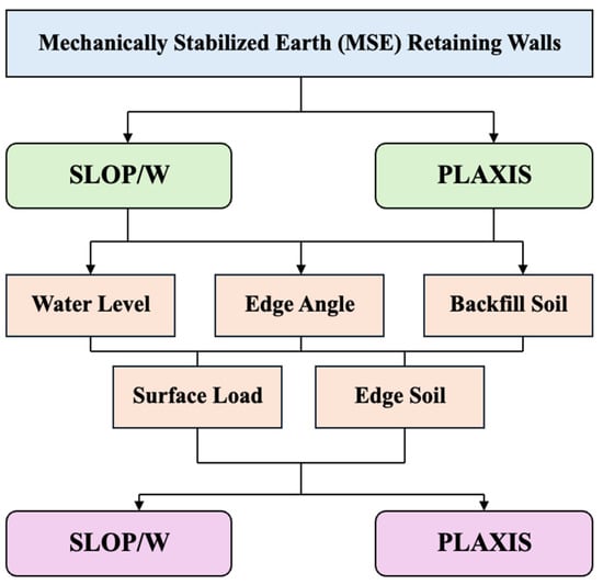 The two-dimensional plane strain representation of the wall described in this manuscript was built in PLAXIS and duplicated in SLOPEW. Construction was simulated in successive stages that mirror the field placement of the backfill and reinforcement. The soil was treated with a Mohr–Coulomb constitutive model, and each reinforcement layer was represented by axial elements assigned the tensile stiffness measured for the chosen metal strips or geosynthetic sheets. This study focuses on the material and loading parameters already reported earlier in this manuscript. Each parameter was varied one at a time within the project-specific ranges, while all other inputs remained fixed. This approach isolates the direct influence of every variable on sliding and overturning resistance. The numerical framework was first verified by reproducing the published factors of safety from peer-reviewed studies that employ the same backfill type and reinforcement materials referenced in this manuscript. The computed sliding and overturning factors of safety closely matched those of the benchmark values, confirming the adequacy of the adopted soil model, boundary placement, and staged construction procedure. Parallel calculations in SLOPEW yielded factors of safety that agree with the PLAXIS results, which reinforces the reliability of the dual-platform approach. After validation, the parameter study revealed that reinforcement length and backfill shear strength exert the greatest control on both sliding and overturning safety, followed by surcharge magnitude. All the findings are synthesized in Figure 1, which traces the full workflow from model definition through verification to variable-by-variable evaluation.