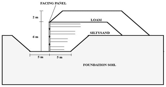Hedjazi [] conducted a finite element analysis of MSE walls by employing welded wire wall panels. The obtained results have been utilized to substantiate the feasibility of employing 3D panels as facings for MSE walls, to identify the failure modes of these panels, and to develop an adequate anchorage system. Alimohammadi and Memon [] conducted an examination of the structural failure of an MSE retaining wall located in Tennessee, USA. They articulated a series of recommendations for the design and construction of prospective retaining walls under analogous geotechnical circumstances.