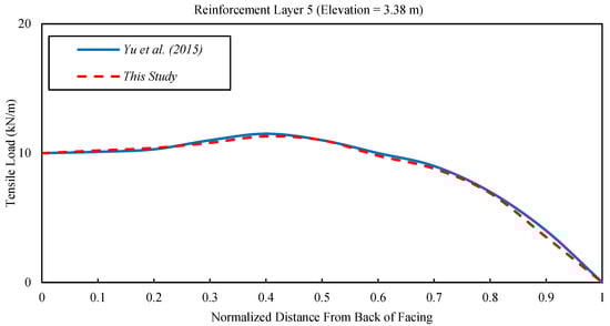 To validate the accuracy of the performed analysis and results, the study performed by Yu et al. [] was used. According to their study, to validate the numerical model developed for this study, a reference case from a 6 m high mechanically stabilized earth (MSE) test wall constructed by the Public Works Research Institute of Japan in 1978 was analyzed, as shown in Figure 2 []. The numerical modeling and analysis of the MSE wall are carried out using the 2-D FE programmer PLAXIS. Using points, lines, and other XY-plane elements, a 2-D geometry model is produced. The properties of the materials and the boundary conditions are defined, and then an FE mesh is built to carry out an FE analysis using PLAXIS. Water pressures and effective stresses are generated as the final step in the input process, which establishes the initial state. In their paper, the FE model uses plain strain type analysis. For shapes having uniform cross sections, the plain strain model is usually used. It is assumed that there are no strains or displacements in the z-direction. However, normal stress acting in the z-direction is considered in the analysis. In PLAXIS, 15 noded triangle elements were added during modeling for the better accuracy of the calculation of stress and deformations at each point. All the variables and parameters were used as defined by Yu et al. []. The wall featured cruciform-shaped concrete panels, each 1.5 m high and 180 mm thick, with silty sand as the backfill material. The wall incorporated a 0.3 m wide, 0.15 m thick concrete leveling pad and 0.02 m thick bearing pads at the panel joints to prevent contact, modeled as beam elements with free rotation. The soil properties for the backfill and foundation were not specified in the original documentation, so assumed values were adopted, prioritizing the elastic modulus (10–50 MPa for backfill, 10–100 MPa for foundation) over strength parameters, as the analysis targeted operational conditions rather than failure []. The properties of the model are provided in Table 1 and Table 2. A linear-elastic Mohr–Coulomb model was employed with reduced stiffness (0.5 times the backfill modulus) within one meter of the facing to reflect lighter compaction practices. The backfill-facing interface was modeled with a strength reduction factor of 0.67, yielding an interface friction angle of 32.91° and adhesion of 0.67 kPa. It should be noted that in the numerical simulation using PLAXIS, the interaction between the reinforcement strips and the surrounding soil was modeled using interface elements. The properties of the soil–strip interface were defined using a reduced friction angle (ϕ) and adhesion (c) based on a strength reduction factor. Specifically, a friction angle of 32.91° and adhesion of 0.67 kPa, as reported in Table 2, were used. These values reflect realistic shear behavior at the soil–reinforcement interface. Numerical simulations using PLAXIS software accurately replicated the wall’s geometry and material properties, with strip elements representing the steel reinforcement. The model’s construction sequence mirrored the physical process, activating panels, backfill layers, and reinforcement iteratively to achieve equilibrium. By comparing the simulated reinforcement and toe loads with the measured data from the test wall, the model demonstrated a reliable prediction of structural behavior under working stress conditions, confirming its suitability for analyzing MSE wall performance in transportation infrastructure applications. Therefore, the comparison between the existing study and the benchmark model presented by Yu et al. [] is presented in Figure 3. According to this figure, there is a high agreement between the results, and the presented models and results in this study are acceptable.