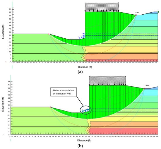 Additionally, the results show that the combination of effective stress reduction, buoyancy effects, and changes in earth pressure distribution results in a decrease in the sliding and overturning factors of safety when the water table level behind the walls rises. The effective stress in the backfill soil is decreased when the water table rises due to an increase in pore water pressure. This can reduce the driving forces that cause instability and shear strength. Furthermore, the overturning moment is lessened by hydrostatic uplift, which lowers the soil’s net weight. Stability evaluations are impacted by the decrease in lateral forces against the wall, which is another effect of the drop in effective ground pressure. Increased water table conditions also change the way reinforcements interact with the surrounding soil mass, which can change the MSE system’s overall stability performance. The apparent disparity between the findings of PLAXIS and SLOPE/W is the result of fundamentally different computing approaches. In contrast to SLOPE/W, which depends on limit equilibrium analysis, PLAXIS uses finite element analysis (FEA) to capture precise stress redistributions, nonlinear soil behavior, and seepage effects. This results in somewhat lower factor of safety values. Because of its oversimplified approach to soil–structure interaction and pore pressure effects, the latter may overestimate stability and presume pre-defined failure surfaces. Thus, its more thorough integration of stress–strain relationships with the groundwater effect is responsible for the little decrease in the PLAXIS-calculated factor of safety. Furthermore, sliding failure occurred in the MSE, but an overturning failure was not seen as the water level rose.