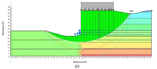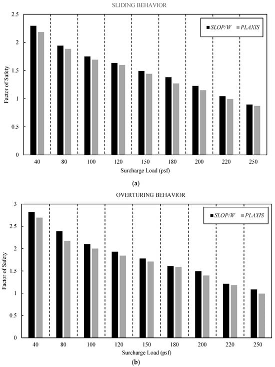 Additionally, as seen in Figure 12a, the findings demonstrate a definite inverse connection between the sliding factor of safety and surcharge load, showing that the stability of the MSE wall against sliding dramatically diminishes as the applied load increases. The increased horizontal stress brought on by surcharge loads, which intensify the driving forces operating parallel to the reinforcing layers, directly results in a decrease in the sliding factor of safety. The reinforced soil system’s resisting shear strength is effectively decreased by this increase in lateral stress, hastening the decline in stability. The sliding factor of safety decreased from 2.294 at 40 psf to 0.896 at 250 psf, indicating a 60.9% total decline according to the data’s numerical trend, which is nonlinear. Higher surcharge loads cause the rate of reduction to become more noticeable, suggesting that slide resistance gradually weakens as increasing stress increases soil deformation and lowers reinforcing effectiveness. The MSE wall’s structural reinforcing layers offer tensile resistance, which prevents excessive sliding, but above a critical load threshold, the cumulative horizontal shear pressures exceed this resistance, raising serious stability issues. In order to minimize shear-induced sliding failure, the obtained findings highlight the need to optimize reinforcement designs, especially for high-surcharge scenarios where careful consideration in reinforcing strength, length, and spacing is required. In order to maintain safe and dependable structural performance under growing surface loads, this trend emphasizes the significance of surcharge control in MSE wall applications and the necessity of thorough stability evaluations. Additionally, SLOP W forecasts a bigger reserve at all loads. The margin remains small at 3.7% at 80 psf and 4.2% at 100 psf, then drops to 2.5% at 120 psf. The factors are 2.30 and 2.20 at 40 psf, meaning that SLOP W is 4.5% higher. After this, deformation starts to dominate the response that PLAXIS records, causing the gap to increase. The difference increases to 4.9% at 150 psf, reaches a peak of around 11.7% at 200 psf, and stays over 8% for the two largest loads. On average, SLOP W is 6.7% more optimistic across the nine examples. When surcharge-induced shear reaches the reinforcement layer, PLAXIS provides a more conservative estimate because the divergence at a high surcharge indicates that the finite element model can detect strain softening and reinforcement slip, which the limit equilibrium idealizes as stiff sliding.