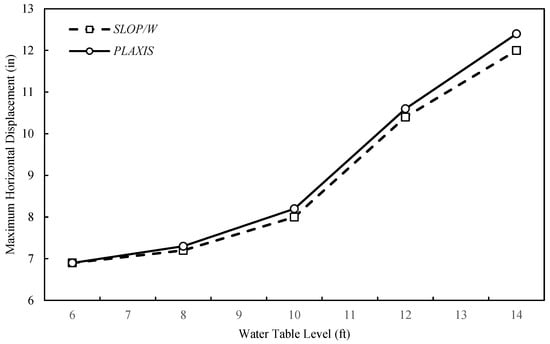 - Because of the decreased shear strength and changed ground pressure distribution, the horizontal wall displacement increased by 79.7% (from 6.9 to 12.4 inches) when the water table rose from 6 to 14 feet. This highlights the significance of having robust drainage systems to prevent excessive lateral movement.