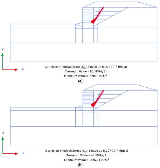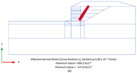 Several tactics may be used to lessen these problems and improve the stability of MSE constructions under certain circumstances. First, the stiffness and shear strength of the reinforced zone may be increased, decreasing the possibility of failure plane propagation through it, by using premium MSE reinforced soil with a higher modulus of elasticity and making sure it is well compacted. Second, adding sturdy drainage systems, like recomposite drains or perforated pipes, can efficiently control the accumulation of pore water pressure, preserving greater effective stresses and shear strength even at high water levels. Third, the structure can be further stabilized by improving the composite strength and load distribution by lengthening the reinforcing components or increasing their density and tensile strength inside the MSE layer. Peripheral instabilities that might put stress on the reinforced zone can also be avoided by routinely checking and maintaining the edge soil’s compaction and erosion resistance. Lastly, a greater sliding S.F. may be guaranteed by performing site-specific geotechnical assessments to improve the design of the soil and reinforcement characteristics under expected hydraulic conditions, improving the long-term durability and safety of the MSE structures. Figure 8, Figure 9 and Figure 10 show the stress distribution for two stable and failed cases.