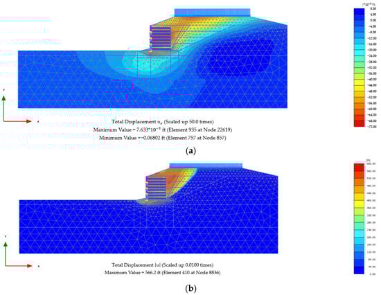 Maximum displacement and stress distribution in a (a) failed case and (b) stable case.