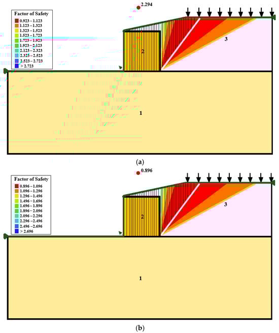 Effect of surcharge load on behavior and sliding factor of safety of MSE wall at (a) 40 psf and (b) 250 psf (in This figure, area 1, 2 and 3 indicate Shale, Reinforced and Fill soils, respectively).
