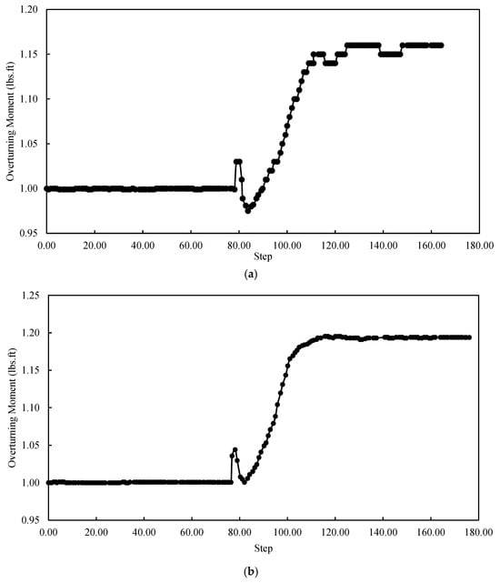 The findings showed that when evaluating the structural integrity and performance of MSE walls, overturning behavior is a crucial consideration. The results on the impact of the water table level on the overturning moment are shown in Figure 13. This figure indicates that the overturning moment increases as the water table level behind the MSE wall rises, mostly as a result of the extra hydrostatic stresses acting on the retained soil mass. The lateral ground pressure distribution changes when the water table rises, increasing the driving force that causes overturning. The observed variations in the maximum overturning moment between water table levels of two, four, six, and eight feet, however, show that the rate of increase is not very significant. This suggests that the influence of water pressure stabilizes rather than continuously increases beyond a certain depth. This behavior is probably caused by the backfill’s internal stress redistribution and the reinforcement’s counteracting action, which keeps the system balanced against overturning forces. The pattern of the overturning factor of safety diminishing with increasing water table levels emphasizes the importance of efficient stress reduction in stability evaluation, even if the overturning moment remained over 1.0 across all water levels examined. Pore water pressure decreases the soil’s effective weight as groundwater levels increase, decreasing the resisting forces that prevent the overturning motion. As a result, the resistive moment declines more noticeably, resulting in a decreased factor of safety, even when the absolute overturning moment does not increase significantly. In order to ensure that excessive water penetration does not jeopardize the system’s capacity to maintain structural stability under a variety of hydraulic circumstances, this decrease highlights the importance of appropriate drainage systems and reinforcing design in MSE wall applications.