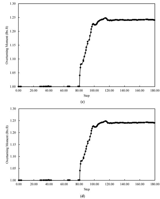 Effect of water table level on overturning moment at (a) 2 ft, (b) 4 ft, (c) 6 ft, and (d) 8 ft.