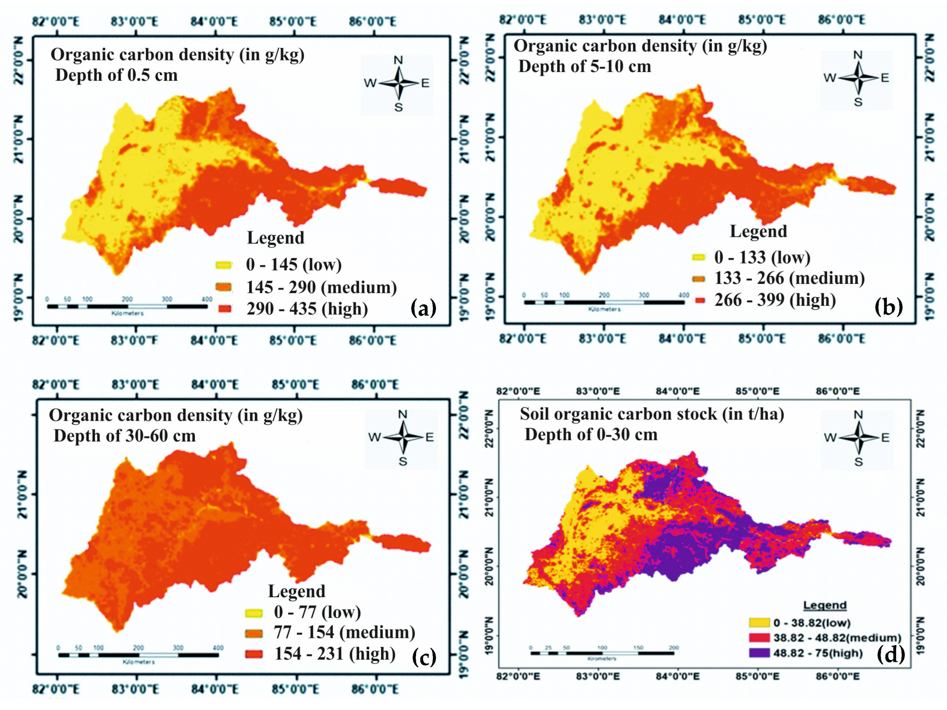 | Organic carbon density (g/kg) | 0–145 | 0–133 | 0–77 | 0 |