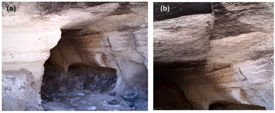 Cavities in Tallet Alsauda: (a) the southern inlet of one of the existing cavities and (b) cracks in the cavity roof.