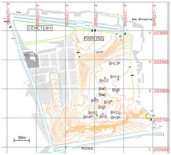 Borehole layout and topography of the Tallet Alsauda study area, Aleppo. Contour lines (orange–red) indicate ground-surface elevation; green and blue lines represent property and drainage boundaries, respectively. Grey areas show existing buildings and paved surfaces. “BH” marks borehole locations (BH1–BH14) drilled for lithological logging, cavity detection, and sampling.