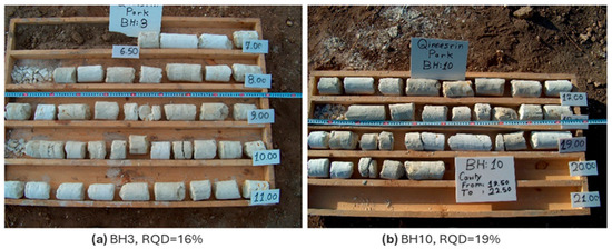 Each borehole was logged systematically for depth, lithostratigraphy, and the presence or absence of open voids. Representative soil and rock specimens were recovered for subsequent geomechanical characterisation of the encountered units. The logs delineate a consistent succession of made ground (random fill) over silty clay, underlain by fractured chalk. As shown in Figure 5, the cores recovered from BH3 and BH10 exhibit intense jointing and a blocky to very blocky structure, indicative of a highly compromised rock mass.