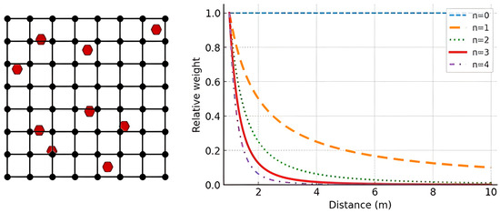 Conceptual illustration of the Inverse Distance Method (IDM). (Left) Spatial arrangement of control points (red symbols) and grid nodes (black dots): red symbols indicate borehole locations used as input for interpolation, while black dots mark nodes where interpolated values are calculated. (Right) decay curve showing the reduction in influence (weight) of each point with increasing distance when p = 3.