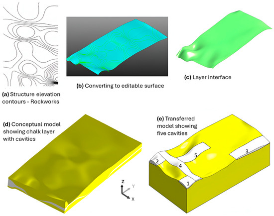 The transfer of the geological model into the numerical environment followed a structured workflow designed to maintain geometric accuracy and topological consistency (see Figure 7). Structural elevation contours generated in RockWorks V2020 [39] were first exported to AutoCAD V2019 for geometric refinement and surface editing. The refined surfaces were then used to define lithological boundaries and construct a conceptual three-dimensional chalk model incorporating the mapped cavities. The resulting solid geometry was subsequently imported into Plaxis-3D V2024.3 [46], where it was discretised into a finite-element mesh for analysis. This integrated process ensured that both the spatial configuration of cavities and the stratigraphic relationships derived from the borehole data were faithfully preserved in the numerical simulations.