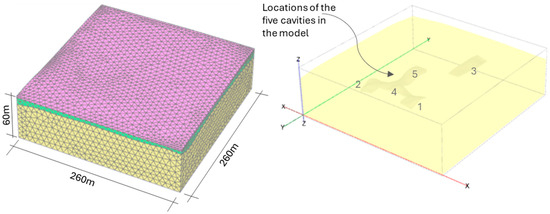 The resulting 3D finite element model is shown in Figure 8. The complete model incorporated the geological layering and cavity geometries derived from the RockWorks model. The model domain extended 260 m × 260 m laterally to minimise boundary effects. Mesh refinement was applied near voids and areas of interest, with minimum element sizes of 0.084 m in the central zone (at cavities) and coarser mesh up to 24 m at the model boundaries. The total final model comprised 43,764 tetrahedral elements and 65,874 nodes. Boundary conditions fixed vertical displacements at the model base and restricted lateral movements along the side boundaries.
