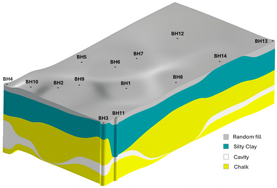 The borehole data were used to construct a three-dimensional geological model of the subsurface using RockWorks V2020 [38]. This model was critical for visualising the distribution and geometry of voids, identifying the relative positions of fill, silty clay, and chalk layers, and guiding the development of numerical meshes.