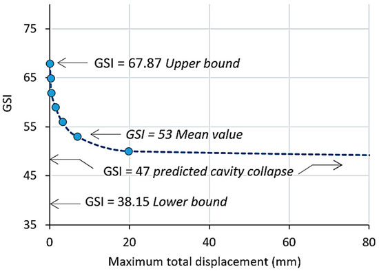 To simulate collapse scenarios, a strength reduction method was applied. The chalk was initialised with upper-bound values of UCS and GSI to represent the best-case stable current state of the rock mass. These parameters were then progressively reduced—primarily by decreasing UCS and GSI toward their lower-bound values—to reflect plausible moisture-induced softening and capture deterioration of rock-mass structure and joint conditions expected in the long term. Progressive parameter reduction enabled observation of displacement and plastic zone development within the model. Collapse was defined as the point at which sudden increases in deformation and the formation of failure zones occurred [11,22,48].