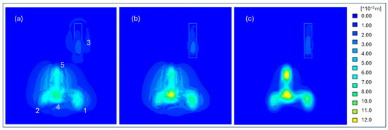Total displacement contours development in the five cavity zones over three selected stages as the GSI was reduced: (a) 61.91, (b) 58.94, and (c) 55.97.