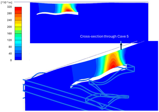 Total vertical displacement (m) through Cave 5 at the collapse threshold (GSI = 47). The arrow marks the cross-section location through Cave 5 shown in the upper inset.