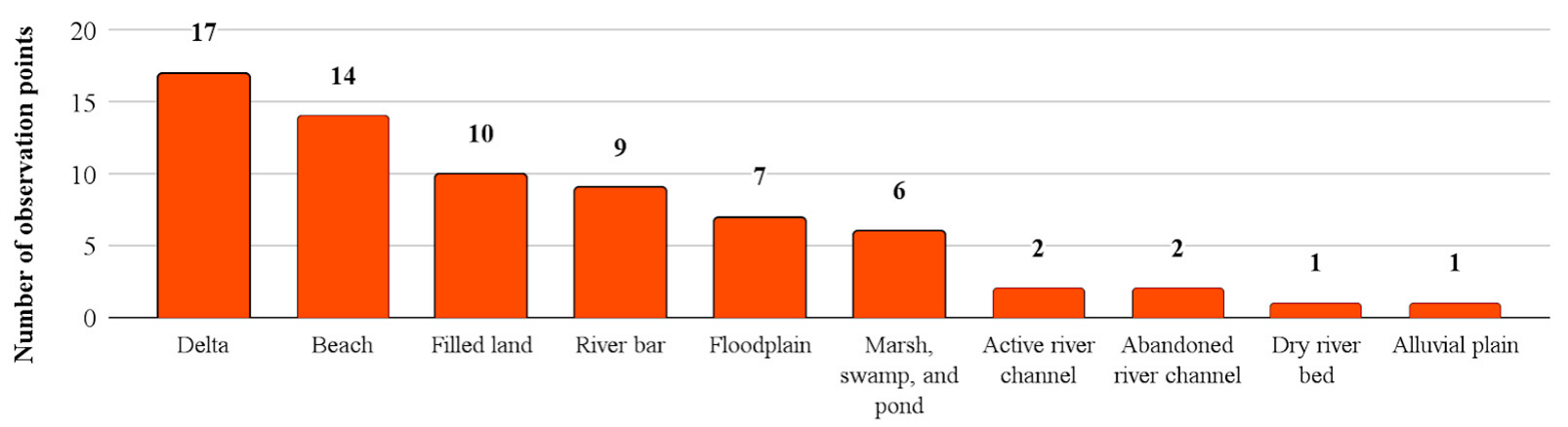 The liquefaction manifestations were distributed across different geomorphological units in the Sarangani Peninsula (Figure 2). The majority of these liquefaction effects were observed on river deltas, while others were along beaches, filled lands, river bars, and floodplains. There were also occasional manifestations of liquefaction on wetlands, active and abandoned river channels, dry riverbeds, and alluvial plains. These observations confirm that low-lying water-saturated geomorphological units are indeed susceptible to liquefaction.