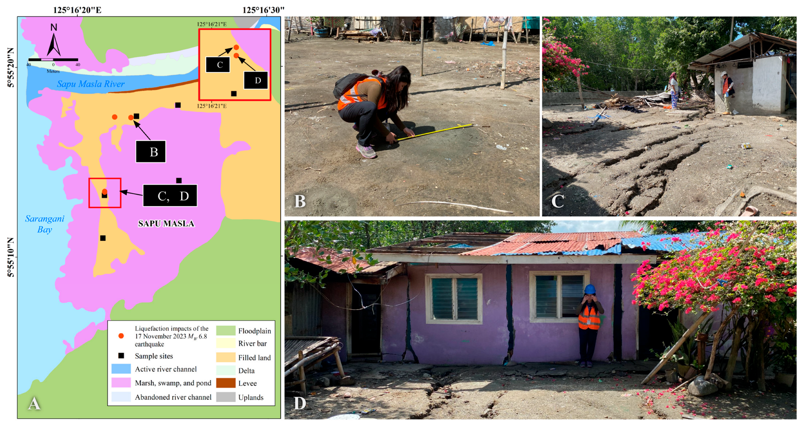 Figure 5. Liquefaction in Brgy. Sapu Masla, Malapatan. (A) Geomorphology map and distribution of liquefaction impacts. (B) Sediments vented out of the ground. (C) Numerous ground fissures along the filled lands. (D) Ground fissures heavily damaged a concrete house.