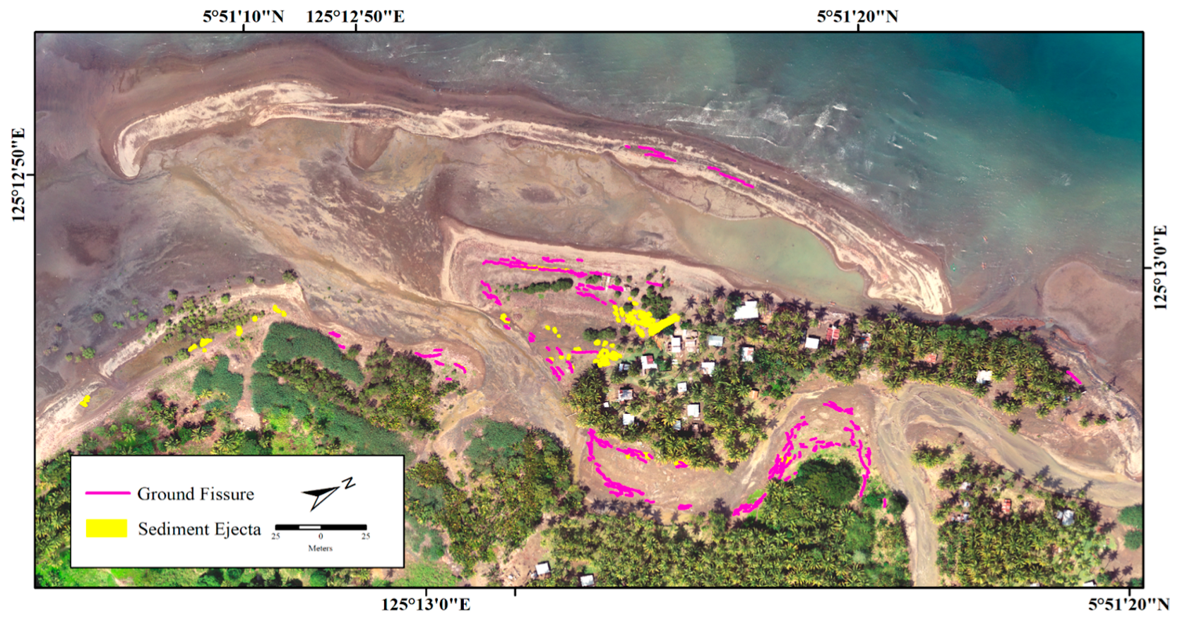 Two days after the MW 6.8 earthquake, a reconnaissance survey was conducted in the affected areas. Initial reports from the local government, news outlets, and individuals on social media aided in rapidly locating possible impacted areas. In areas with confirmed liquefaction, detailed mapping was immediately conducted before its surface manifestations were washed away by rainfall, tides, fluvial processes, and human interventions. The remotely piloted aircraft (RPA) technology was also used to map areas with broader liquefaction impacts. A Phantom 4 Pro RPA with a 20-megapixel camera (DJI, Shenzhen, China) was flown at 30 to 50 m above the ground. The RPA-derived photos were processed to produce orthophotographs and digital elevation models (DEM). These datasets have a resolution ranging from 1 to 3 cm/pixel. Additional measurements of liquefaction impacts using these generated data were carried out in ArcGIS 10.