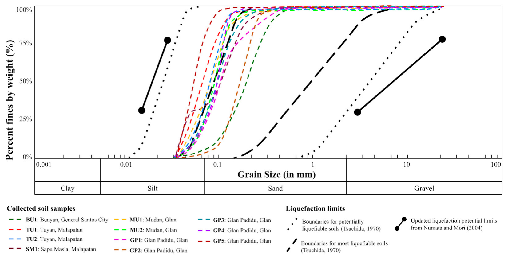 Eleven sediment ejecta samples collected from selected liquefied sites were compared with the liquefiable soil boundaries set by Tsuchida [25], and Numata and Mori [8] (Figure 8). The ejecta are primarily composed of silt and sand-sized sediments. In particular, those taken in Buayan (BU1) and Glan Padidu (GP1 and GP2) fall completely within the boundaries for most liquefiable soils. Conversely, the silt-dominated sediment samples from Tuyan (TU1 and TU2), Mudan (MU1 and MU2), and Glan Padidu (GP5) are within the established boundaries for potentially liquefiable soils. The remaining samples from Sapu Masla (SM1) and Glan Padidu (GP3 and GP4) have a mix of sand and silt-sized grains and plot within the boundaries of both potentially liquefiable and most liquefiable soils.