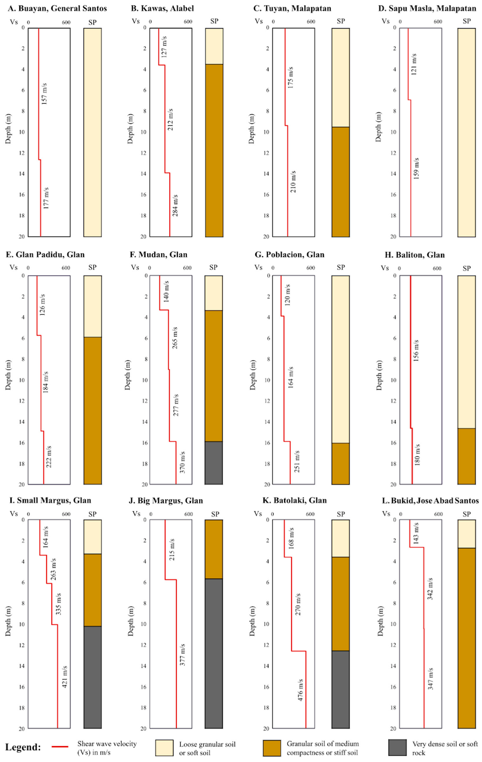 The VS profiles and their corresponding site classes were obtained using ReMi (Figure 9). Eleven sites have VS30 values ranging from 170 m/s to 339 m/s, indicating that these are soft to stiff soils classified as Class SD and SE, which may have loose and granular sediments. In contrast, the recorded VS30 in Big Margus is 425 m/s, suggesting a subsurface of very dense soil to soft rock material classified as Class SC. Since liquefaction occurred along a sandy beach in Big Margus (Table A1), the liquefiable layer may have been confined to the upper layer of granular soil with medium compactness as observed in the field, and in the upper 5.7 m of soil inferred from the VS profile (Figure 9). For the rest of the sites, ReMi surveys confirm that there are sediment layers within 20 m below the ground that can indeed liquefy, as long as these are water-saturated, and with the right ground shaking conditions.