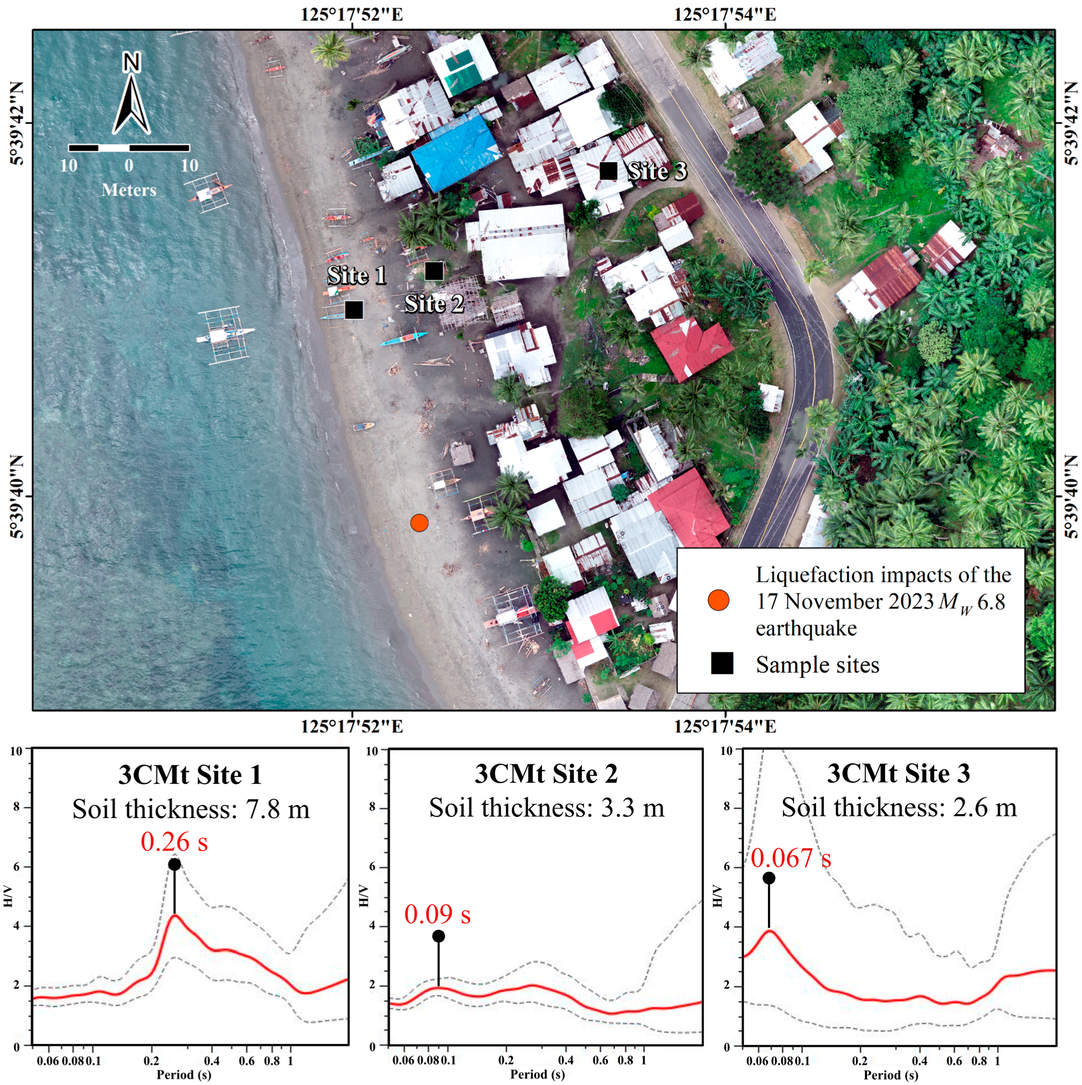 Two to five 3CMt surveys were also conducted on all of the 12 sites. The period values listed in Table 1 vary greatly, with the shortest period measurements ranging from 0.07 to 0.18 s in Glan Padidu, and the longest period measurements ranging from 0.94 to 1.1 s in Buayan. Using Equation (3), which correlates the site period values to the thickness of the uppermost soil layer, it was determined that the short-period sites also have thinner soil covers, while long-period sites have thicker soil covers. Generally, the soil is also thinner near the uplands with generally steeper slopes and are usually subjected to erosional processes. The sediments then accumulate downslope and become thicker towards the lowlands [34,35]. For example, on a beach in Small Margus, the soil thickness varies from 2.6 m near the uplands to 7.8 m by the shore (Figure 10).