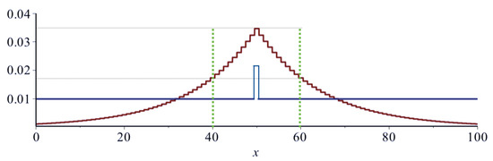 Comparison between the geometric (red) and the randomized response (blue) mechanisms. The area between 40 and 60, delimited by the green lines, represents the sub-domain where the geometric mechanism satisfies also the discrete metric -privacy with .