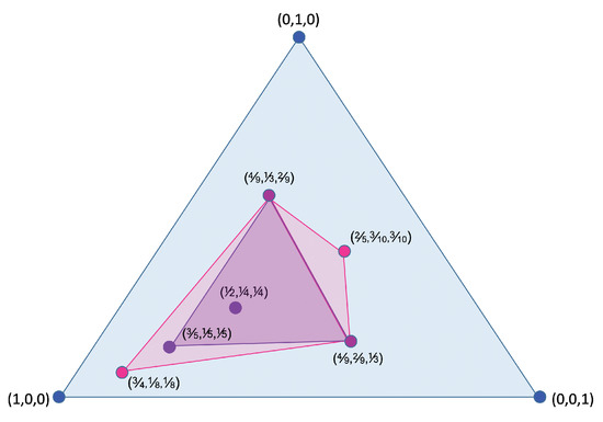 The simplex and the convex hulls of the posterior distributions in Example 5.
