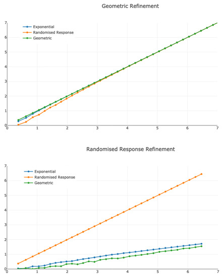 Consider datasets of records containing the age of people, expressed as natural numbers from 0 to 100, and assume that each dataset in contains at least 100 records. Consider two queries, and , which give the rounded average age and the minimum age of the people in x, respectively. Finally, consider the truncated geometric mechanism (cf. Definition 10), and the randomized response mechanism (cf. Definition 13). It is easy to see that is ε-DP, and it is possible to prove that (cf. Theorem 14). We can then conclude that is ε-DP as well, and that in general it is safe to replace by for whatever query. On the other hand, , so we cannot expect that it is safe to replace by in any context. In fact, is ε-DP, but isnotε-DP, despite the fact that both mechanisms are constructed using the same privacy parameter ε. Hence, we can conclude that a refinement relation based only on the comparison of the ε parameters would not be robust, at least not for a direct replacement in an arbitrary context. Note that is -DP. In order to make it ε-DP, we should divide the parameter ε by the sensitivity of g (with respect to the ordinary distance on natural numbers), which is 100, i.e., use . For , this is not necessary because it is defined using the discrete metric on , and the sensitivity of g with respect to this metric is 1.