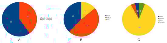 Characterization of the SMEs participating in the case study—(A) Type of auditing (Type 1 and Type 2); (B) type of company: small, medium, and micro enterprise; and, (C) companies per district.